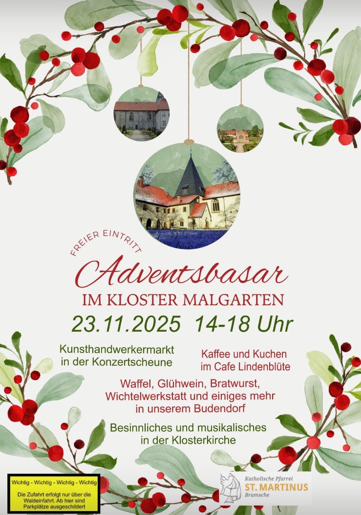 Erstmals veranstaltet die Kirchgemeinde St. Johannes Evangelist Malgarten ihren beliebten traditionellen Adventsbasar auf dem nördlichen Klostergelände – in der Konzertscheune und in deren Umfeld, in der Kirche und im Café Lindenblüte. Maria Breer-Dühnen vom Kulturforum im Kloster Malgarten öffnet ihr wunderschönes Atelier hestia in Haus Nr. 6, dort gibt es Schönes zu schauen und auch zu erwerben. Im Beginenland, also auf der Ostseite des Amtsrichterhauses, wird Barbara Brosch von beginen in malgarten eine meditative Kerzenglas-Spirale anbieten.